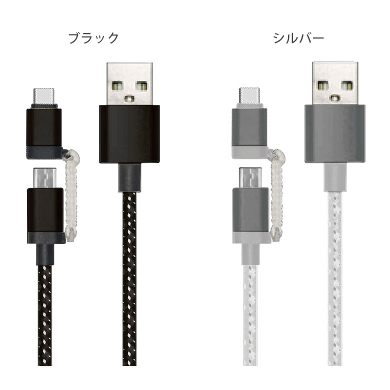 Type-C変換アダプタ付き microUSB アルミニウムケーブル 1m 急速充電タイプ 2.4A 2wayケーブル 充電 通信 Androidスマートフォン対応 ブラック シルバー ゴールド 藤本電業